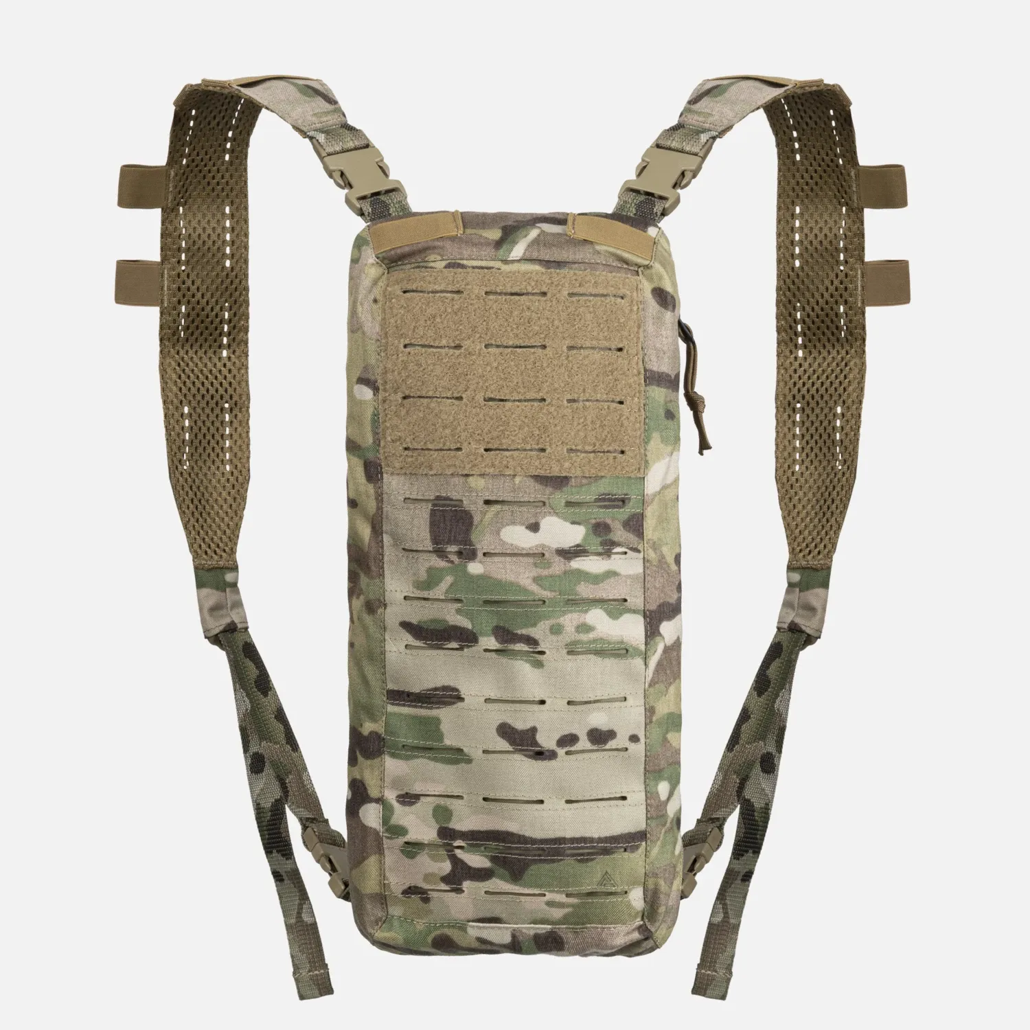 Легкий универсальный держатель для гидратационного пузыря. Подходит для большинства популярных мочевых пузырей емкостью 2 литра. Трехмерный дизайн позволяет носителю расширяться наружу, не причиняя дискомфорта пользователю. Боковая застежка-молния обеспечивает легкий доступ к мочевому пузырю. На внешней поверхности имеются прорези MOLLE/ PALS, позволяющие прикреплять дополнительные подсумки. Пакет Multi Hydro может крепиться несколькими способами: с помощью PALS, встроенных ремней или к H-образному ремню безопасности MOSQUITO®. Трубка гидратационного баллона может быть направлена как влево, так и вправо.